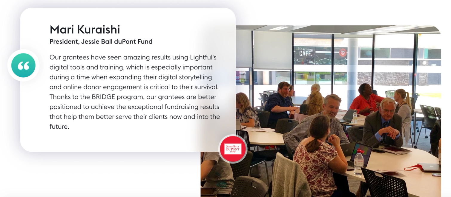 “Our grantees have seen amazing results using Lightful's digital tools and training, which is especially important during a time when expanding their digital storytelling and online donor engagement is critical to their survival.” - Mari Kuraishi President, Jessie Ball duPont Fund.