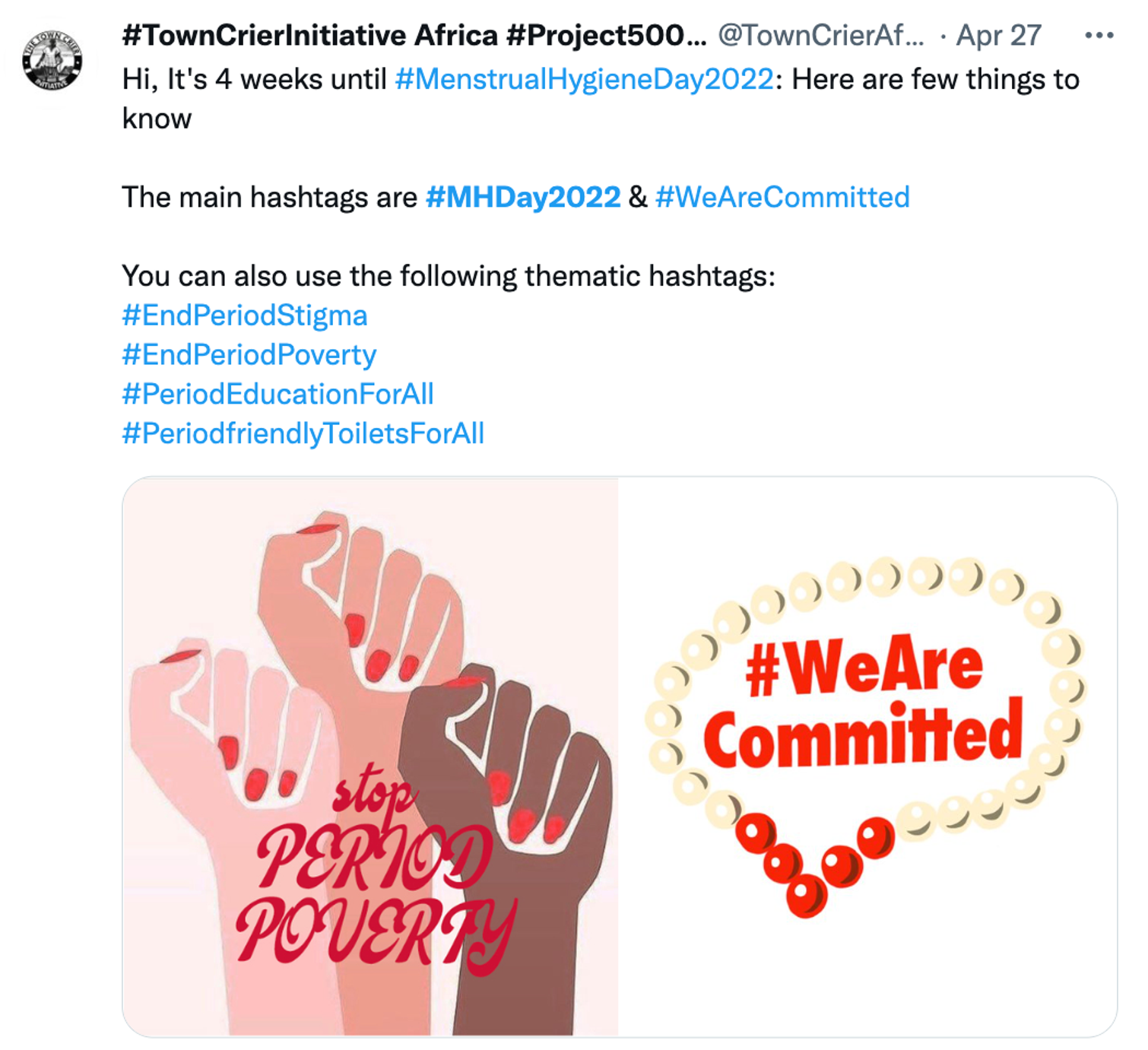 Tag the MH Day social channels: @menstrualhygieneday (Facebook, Instagram) and @mhday28may (Twitter)