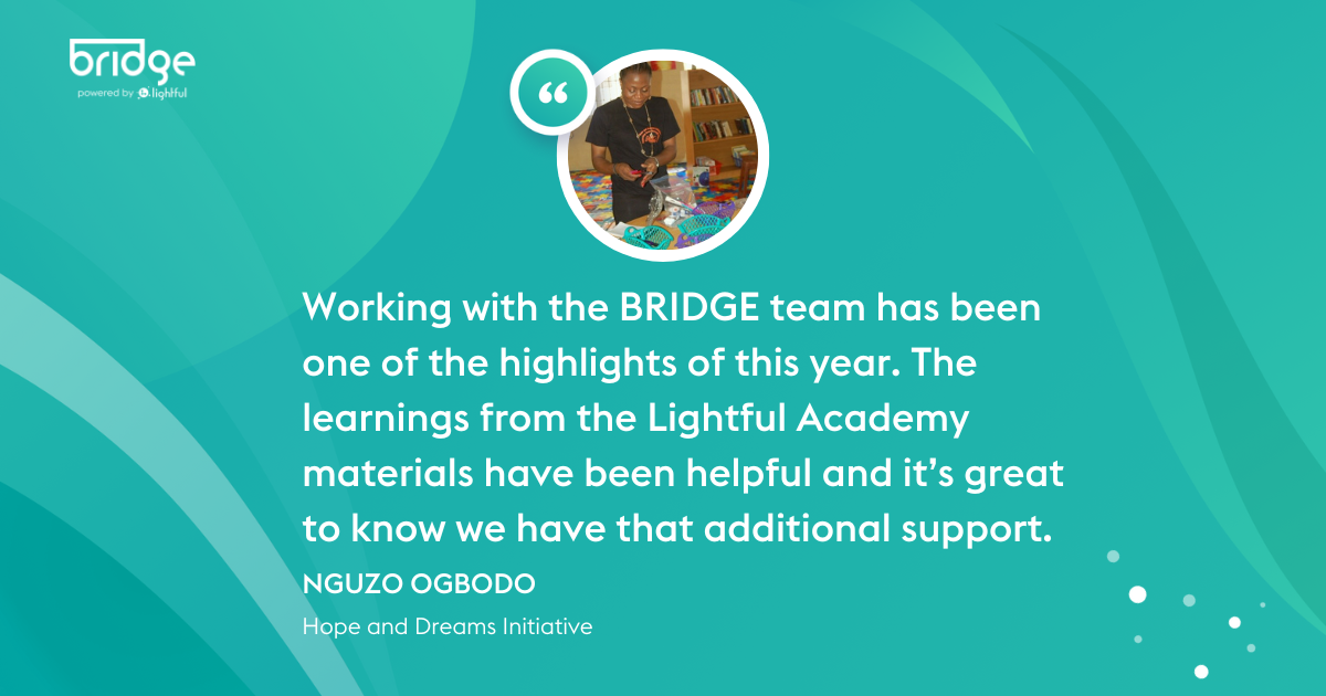 Working with the BRIDGE team has been one of the highlights of this year, the learnings from Lightful Academy materials have been helpful and it’s great to know we have that additional support.