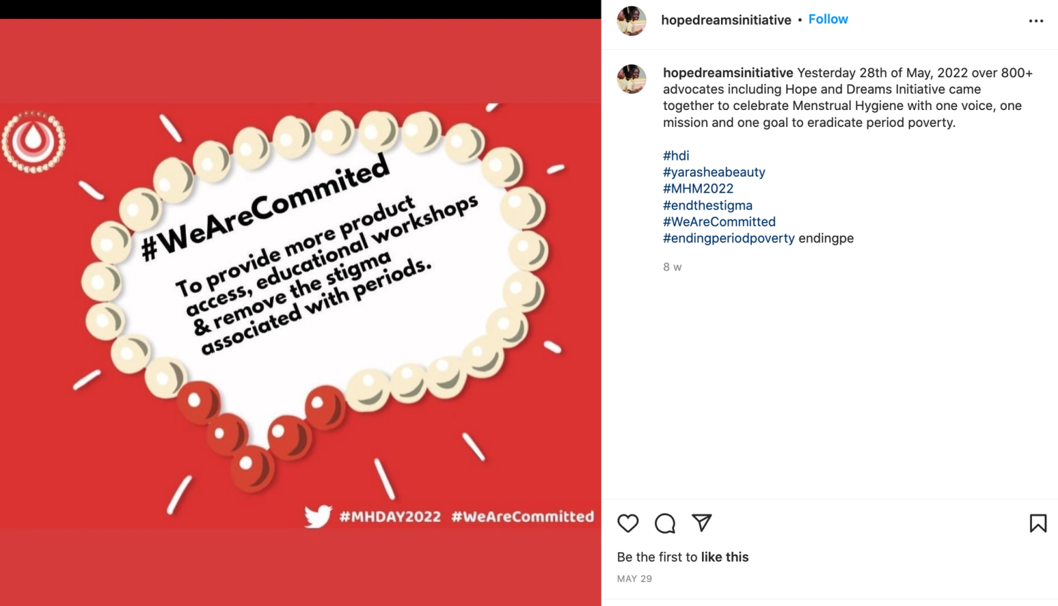 Hopes and Dreams Initiative are part of our #MHDay2022 BRIDGE cohort in partnership with WASH United and The Case For Her and our goal is to help them raise awareness and champion education around menstrual health and hygiene by improving their digital fundraising and advocacy skills.