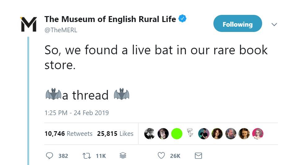 Why does it work? Whilst millions of people enjoy outings to museums, they are mostly places of learning. Therefore, you expect their Twitter account to be academic, scholarly and perhaps even a bit ‘stuffy’. Instead, it’s hilarious and witty. Take this gem of a thread about finding a bat in their rare book store.