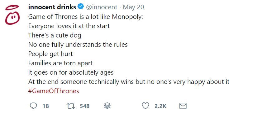 You’d think there’s only so much that you can say about smoothies, and you’d be right. You’d think that a drinks brand’s Twitter feed would be all about the ‘sell, sell, sell’. Well, you’d be wrong. The brilliant thing about Innocent’s account is that they understand it’s not about constantly marketing their drinks but rather about building a loyal following based on humour, topical news and tapping in to what people are genuinely interested in and already talking about. And then occasionally mentioning their products.