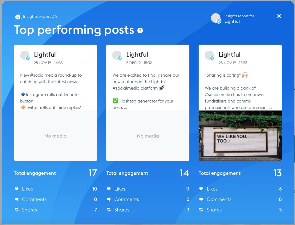 Not a Lightful user? You can still find out which of your content performed the best by looking through Twitter Analytics, Facebook and Instagram Insights – it will just be more time-consuming.