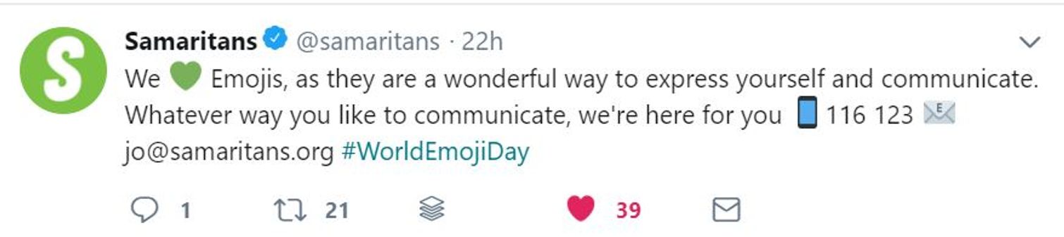 Samaritans used the trending hashtag to express their love of emoji and to remind people that, however they like to communicate, the charity’s helpline is there for them if they want to call, text or email.