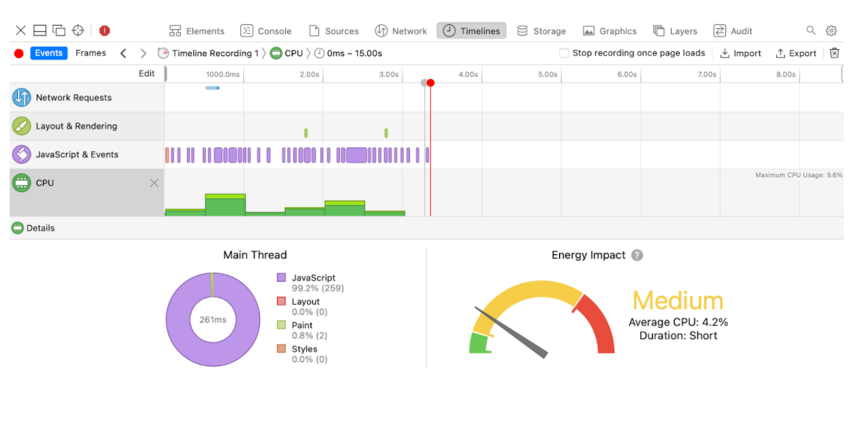 In addition to page size, it’s also worth keeping an eye on the energy impact that your site has on a user’s device. This is especially relevant if your site has a lot of interactions and animations. Again, most browser developer tools have ways of recording and measuring the performance of a site as you interact with it and Safari is particularly good for this.