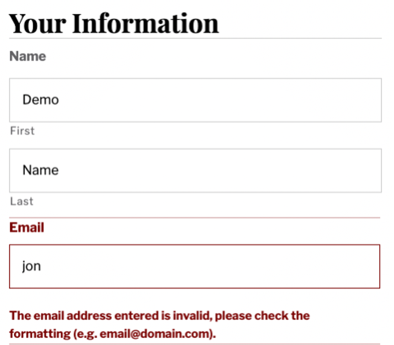 Here's a very simple example from the Cultural Alliance of Fairfield County, where a field is missing and the error message clearly shows where and what is missing.