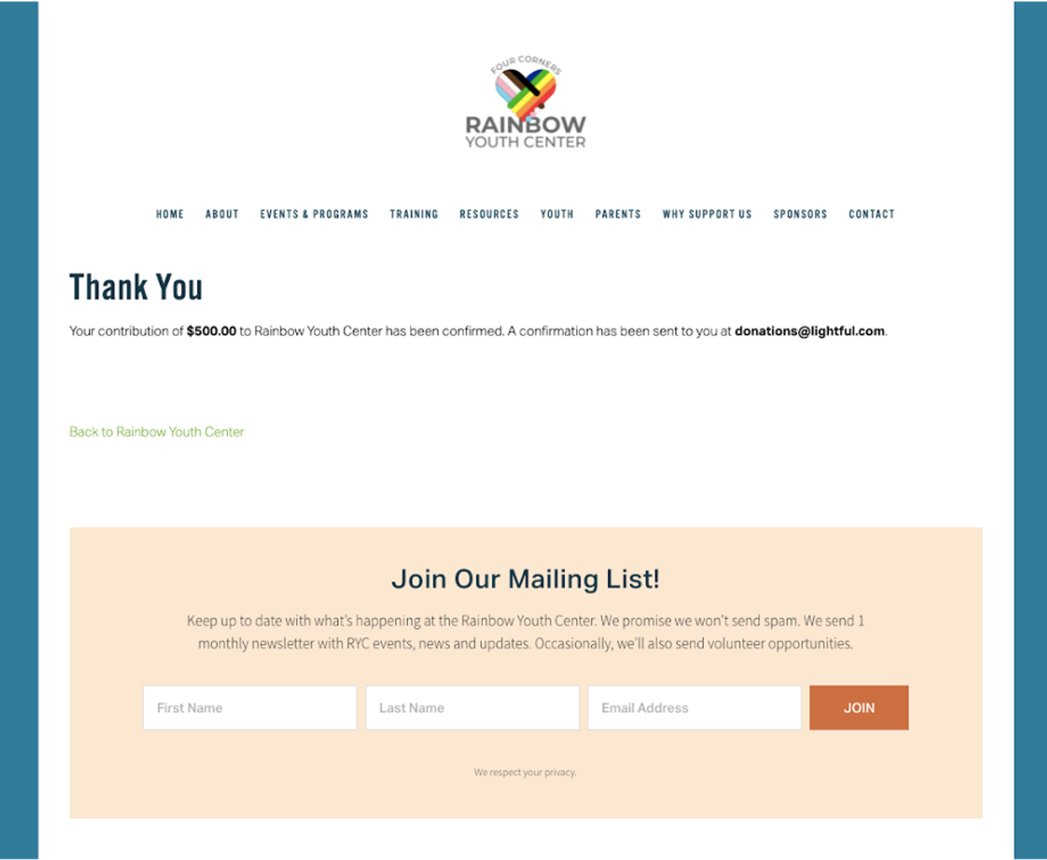 We appreciated how the Four Corners Rainbow Youth Center promote newsletter signups after a donation, and set the boundaries early - explaining how often emails are sent, and what they include - helping people make an informed choice about opting in.
