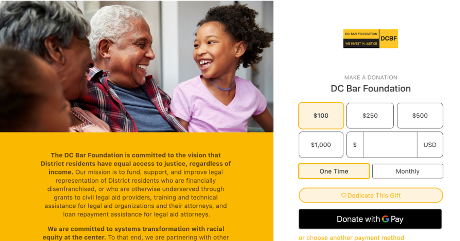 The DC Bar Foundation use the Give Lively platform, which offer a Donate with Google Pay option if you are browsing on an android device, but not if you aren't. These clever personalisation tips can really help boost conversion rates.