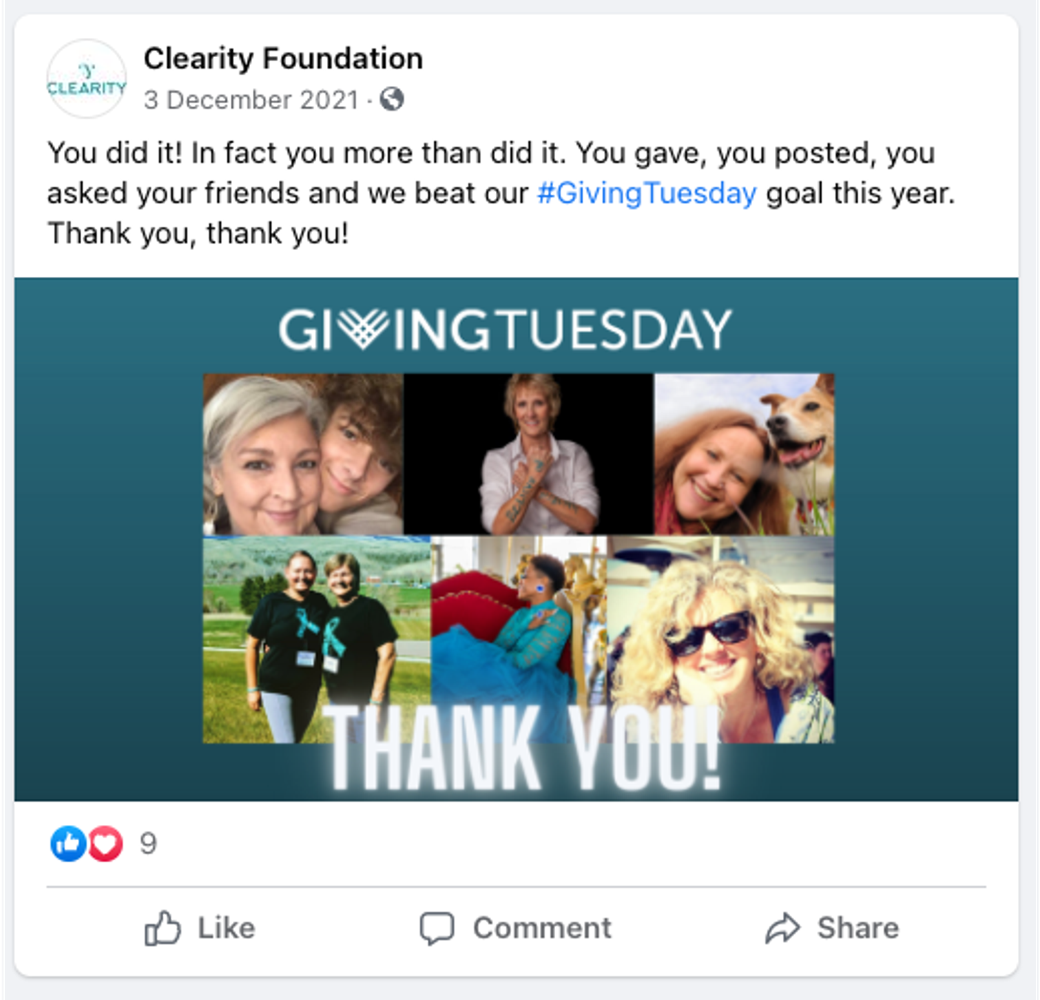 Their campaign messaging was strong and consistent, and shared across different channels including Facebook on the day of Giving Tuesday itself.