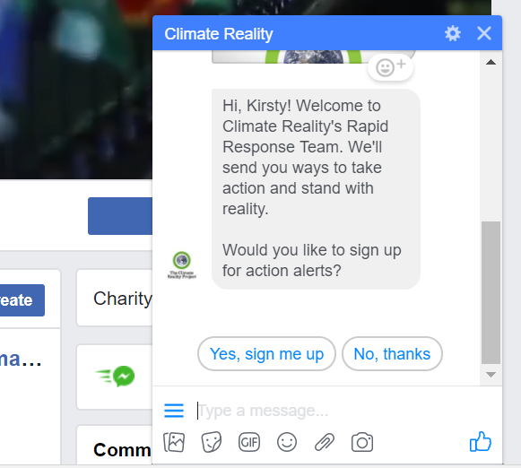 The Climate Reality Project is a small charity with just one person in their communications team. They set up a chatbot themselves on Facebook to build their email list and educate people on the importance of taking action on climate change. This is a really clever and simple way to grow your audience and just shows that chatbots are not just reserved for big charities.