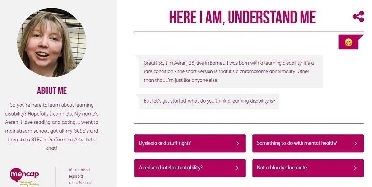 Unlike the above chatbots, Mencap’s chatbot lives on its website rather than on Facebook. The chatbot is part of their #HereIAm campaign, which aims to help people understand more about what it’s like to have a learning disability through talking to Aeren who is learning disabled. Another difference is that people can’t ask their own questions, rather they have to choose from pre-set answers (a decision tree). Although this may seem less ‘human’ than the Facebook chatbots, Aeren certainly feels very real. Most importantly, Mencap reported that the chatbot has led to a 3% increase in awareness of the charity.