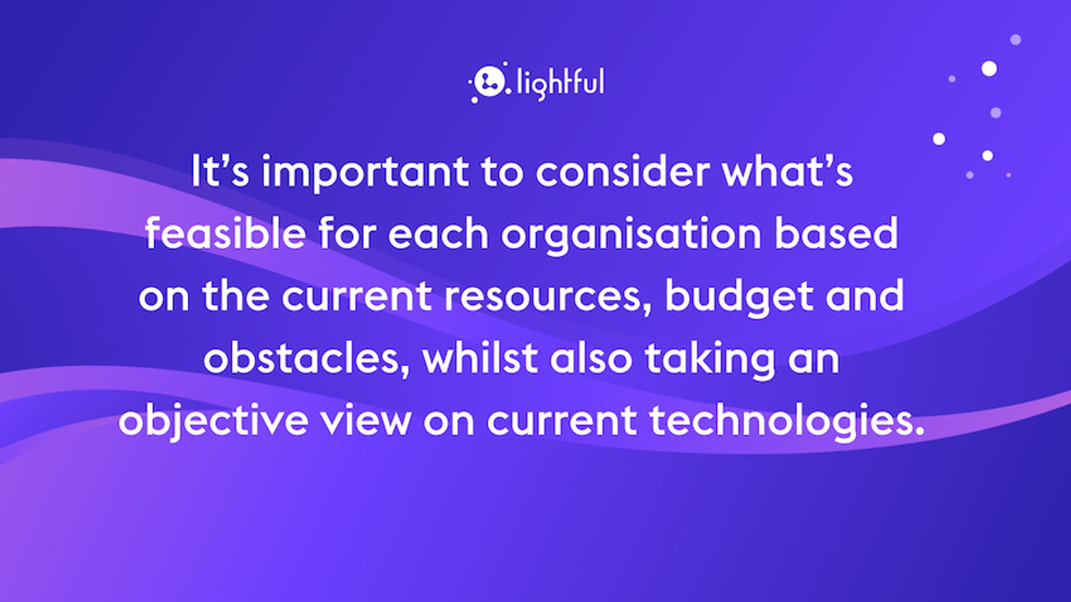 Across this, investing in skills and knowledge for the team to support this journey is key. It’s important to consider what’s feasible for each organisation based on the current resources, budget and obstacles, whilst also taking an objective view on current technologies.