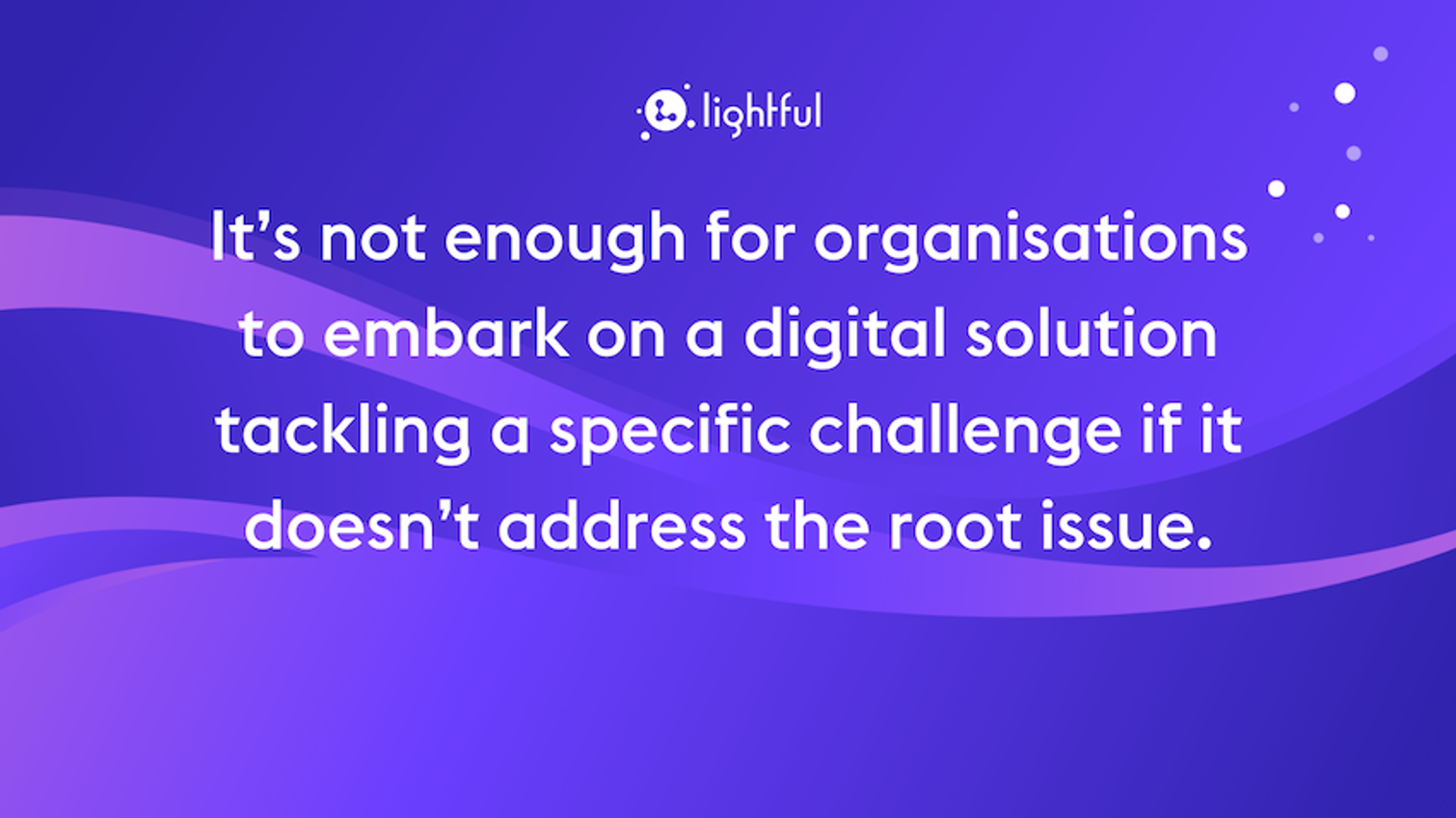 Whilst these projects initially appear distinct, once we explored them further in intensive workshops, similarities began to emerge. Organisations were experiencing common challenges stemming from: inefficient processes, inaccurate data and/or lower engagement levels from stakeholders. What we realised is that, it’s not enough for organisations to embark on a digital solution tackling a specific challenge if it doesn’t address the root issue. There is even a risk that doing so could further embed and exacerbate inefficient processes.