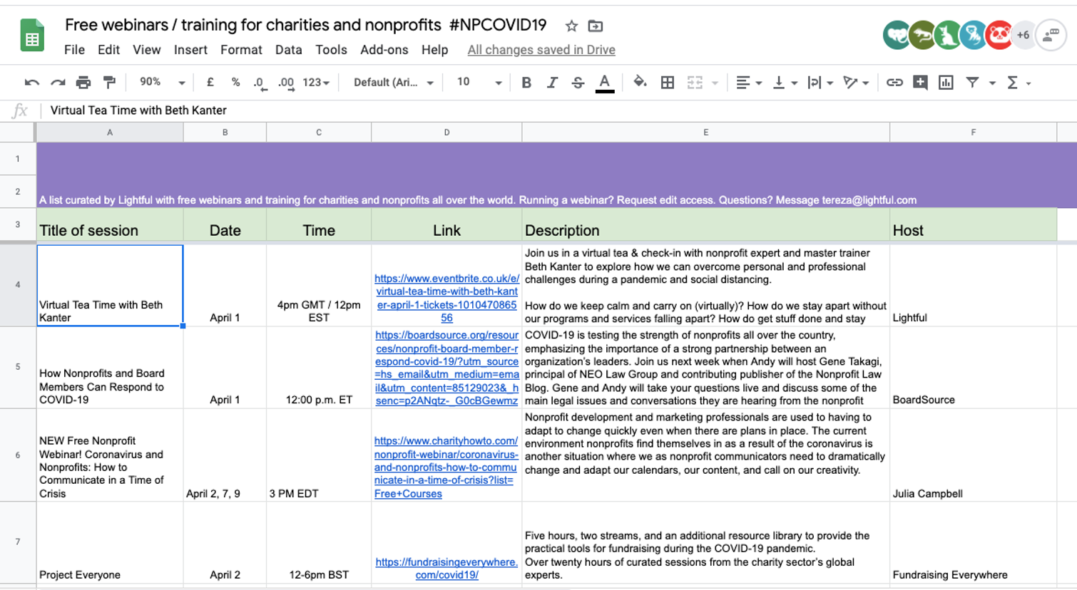 We have created a crowdsourced webinar spreadsheet to gather all the free webinars and training happening in the sector.