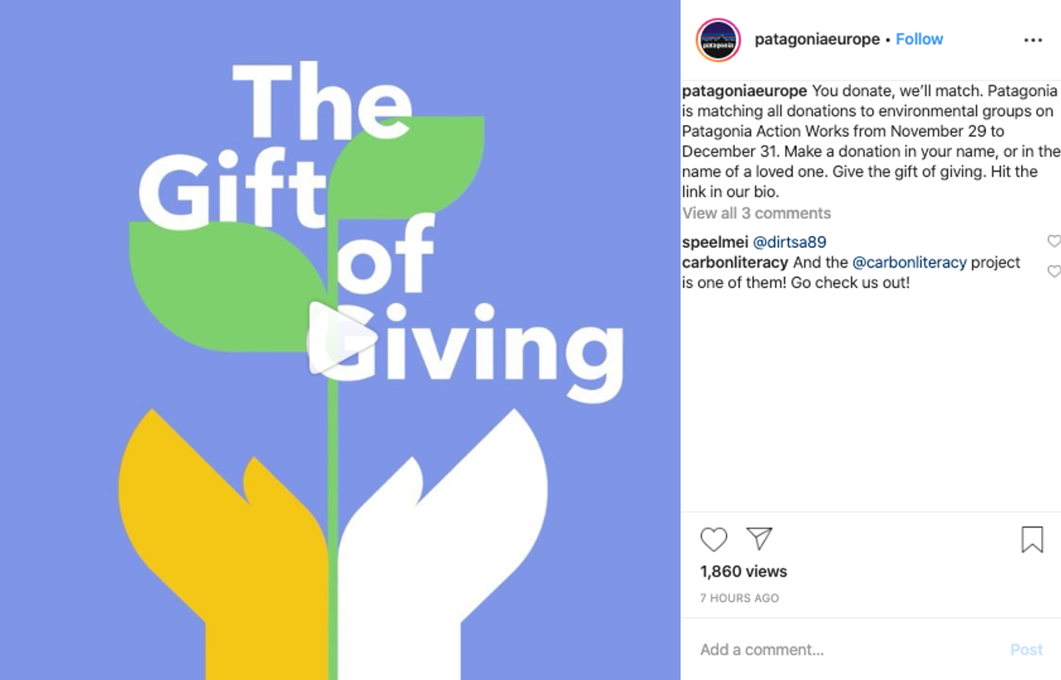 Outdoor clothing company Patagonia have partnered with One Percent for the Planet since 2016. They agreed to donate 100% of their Black Friday sales to organisations dedicated to clean water, air and soil.