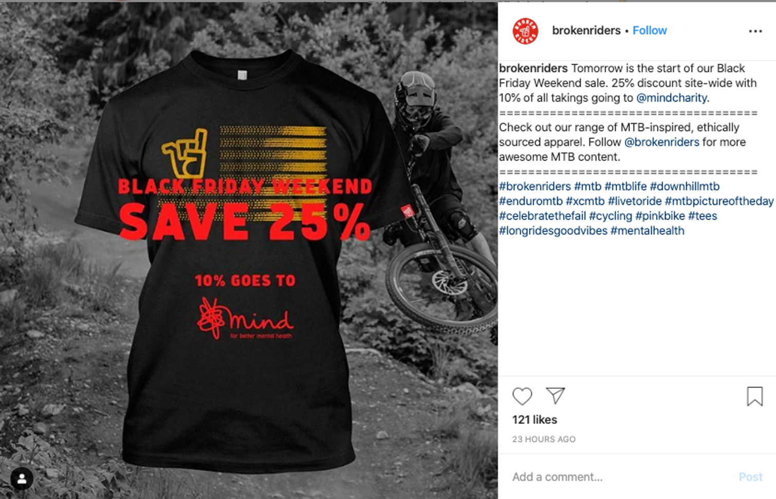 Mountain Bike company Broken Riders have offered 20% off for their customers and are also giving 10% of all of their sales to mental health charity Mind.