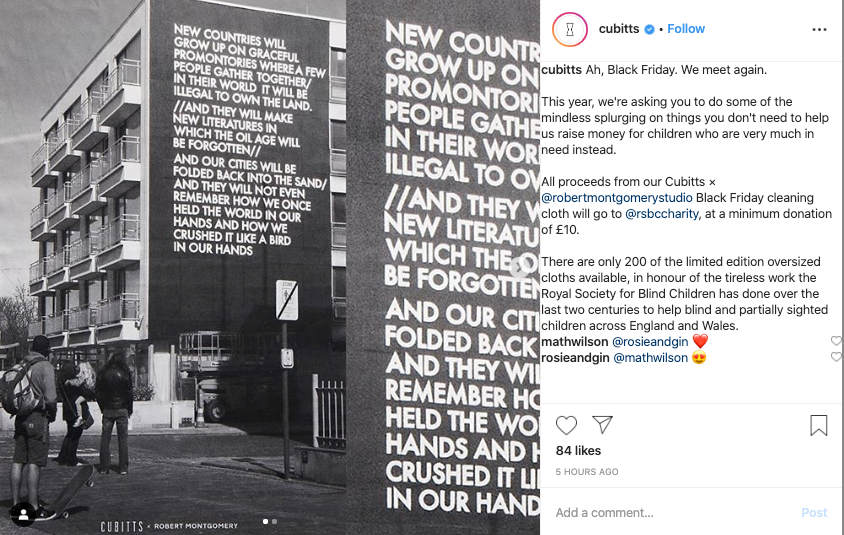 Glasses company Cubitts have created a Black Friday glasses cloth designed by Robert Montgomery. They will be available in-store and online with all proceeds going to the Royal Society for Blind Children.