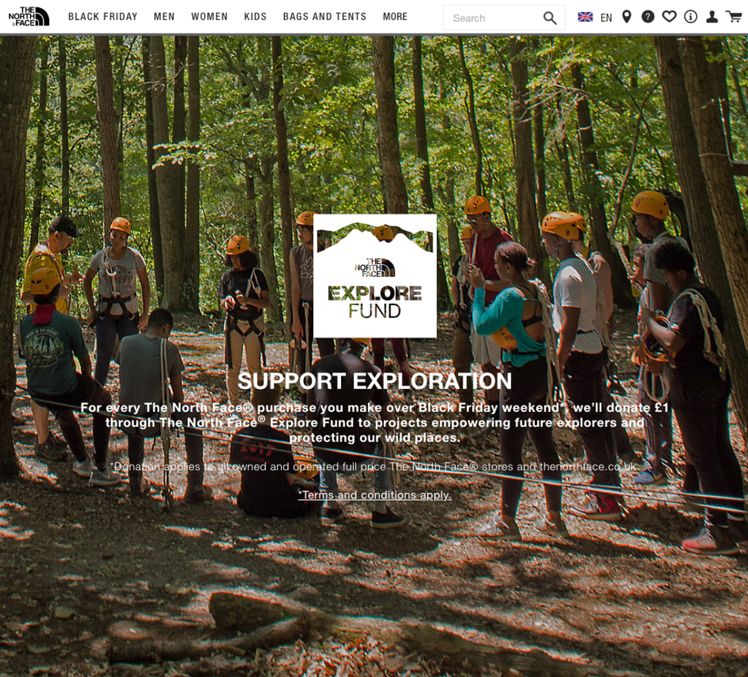 The North Face are donating £1 for every purchase made over the Black Friday weekend in Germany, Italy and the UK. All of the donations will go to Explore fund which is designed to create greater access diversity and equality in the outdoors, helping young people across Europe realise their potential through exploration.