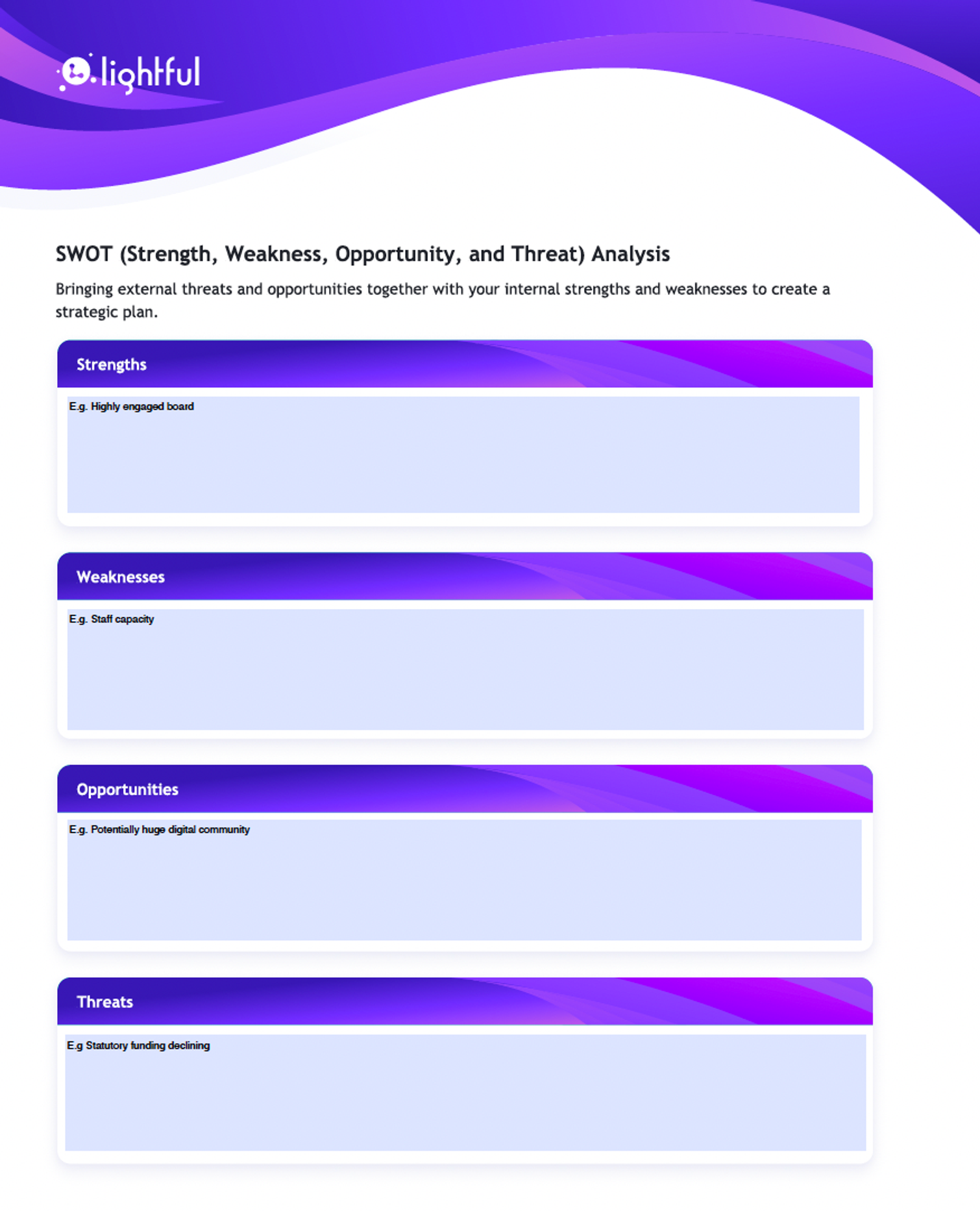 A SWOT analysis (Strengths, Weaknesses, Opportunities, Threats) is a framework that can help nonprofits understand where they are and what they need to do.