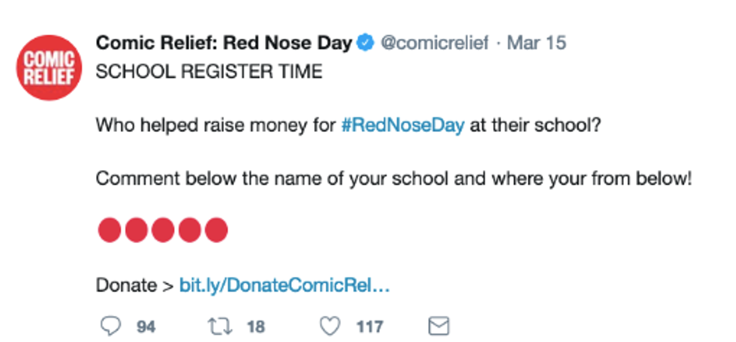 Providing your audience with a call to action, or what you want them to do after seeing your post is a great way to spread your organisation’s message. Asking a question for your audience to answer via the comments is a great way to start a conversation. Also getting people to have a claim to fame, in the image above asking you to name your school, gets people excited and feel part of something. Another great way to engage your audience and challenge them is to create a #SelfieChallenge. This will encourage your audience to take a photo and post it on their own network to then increase a) The amount of “branded content” posted b) share their involvement with their own audience. Comic Relief relies on their audience to help them reach their target. Only together will they succeed.