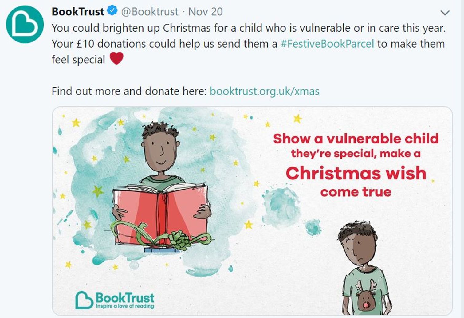 When I was a kid, I adored reading (and still do!) so I absolutely love this campaign by BookTrust to send a festive book parcel to a child who is vulnerable or in care. It’s a really tangible ask and for only £10 you know that your donation could make a real difference to a child – helping them discover a love for books.