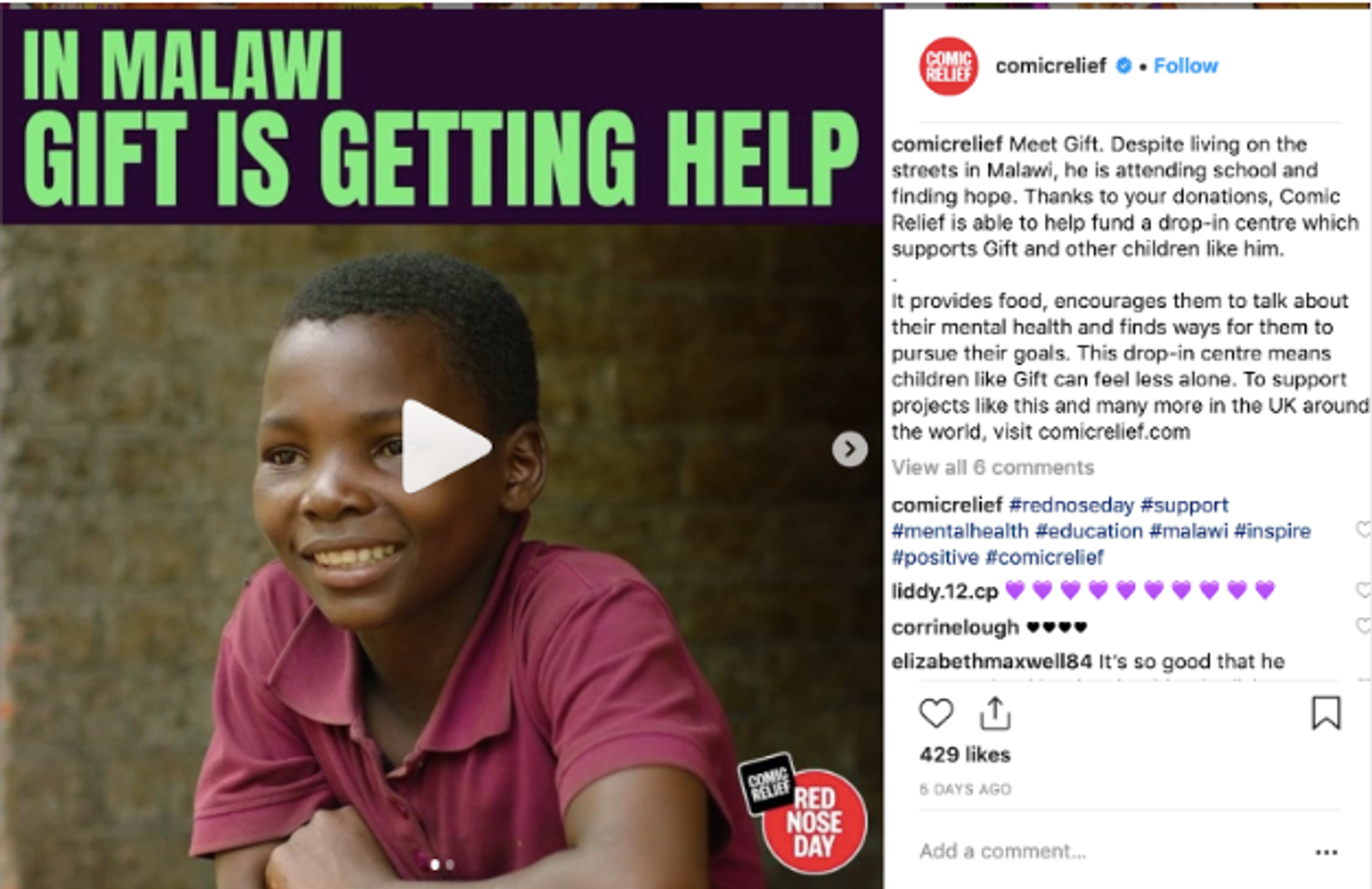 Comic Relief helps people in 15 different countries worldwide. The money raised during Red Nose Day will be granted to charities and organisations who are targeting change in specific areas. These Comic Relief have named as; Children Survive and Thrive; Global Mental Health Matters; Fighting for Gender Justice; A Safe Place to Be. These are “Core Issues” to their organisation. To engage their audience and share how they are able to impact so many lives it is important to share stories which relate to their core issues within their marketing. Videos, infographics and photos have all been created to tell their audience more about the work they are doing across the world.