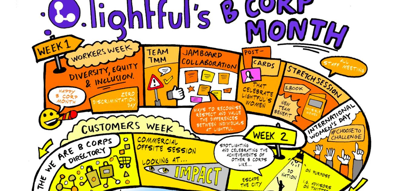 At our last all-staff (virtual) party, the wonderful artist Jenny Leonard ran a mindful drawing class. Afterwards, we asked Jenny to create a visual representation of what Lightful’s plans were for B Corp Month. I’m pleased to share that here and outline a bit more of how we’re integrating business and impact in everything we do.