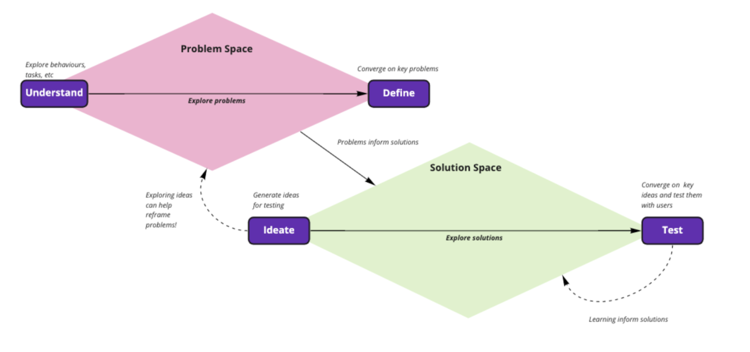 We used a human-centred, design thinking led approach to identify key challenges in the social prescribing sector, and used participatory design techniques to address these challenges. This involves four phases: Understand, Define, Ideate and Test. Each of these phases is designed to address clearly identified and articulated needs and challenges.
