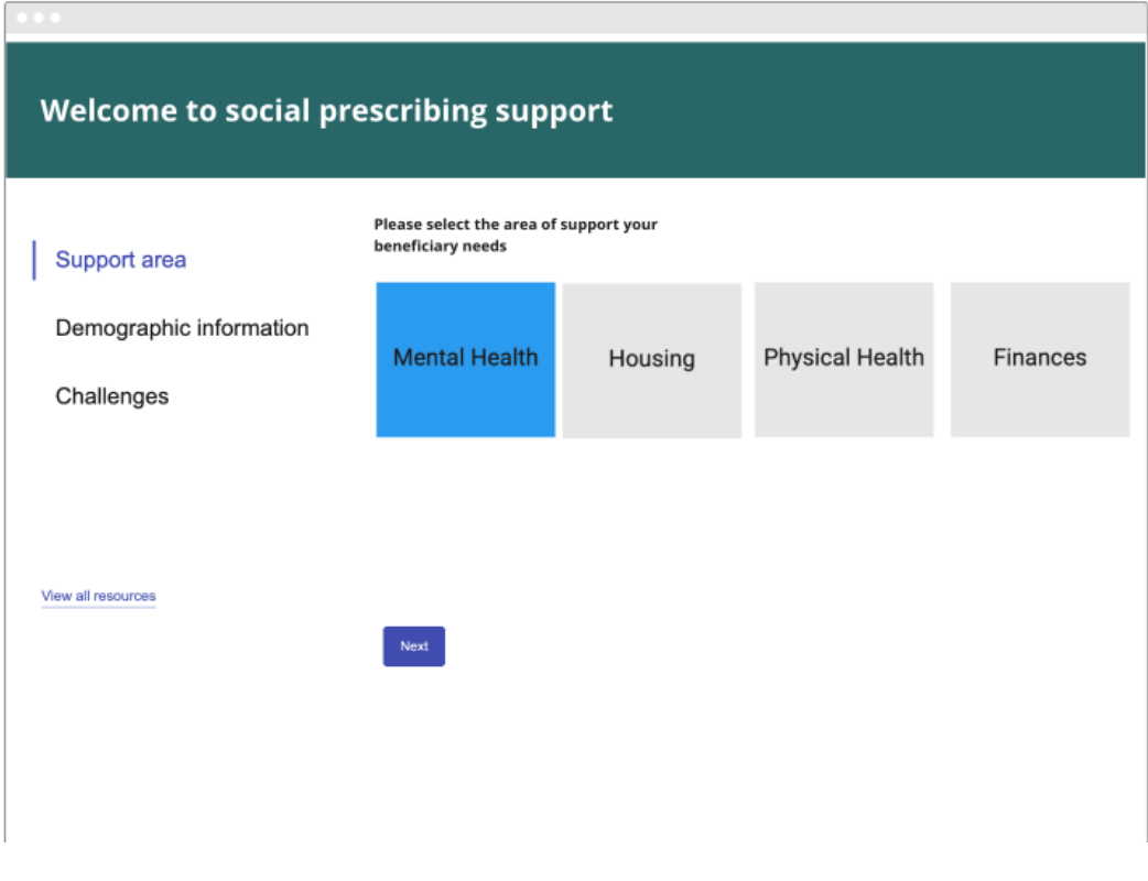 Ultimately, what we created was a persona-led social prescribing support tool. This innovative tool strengthens data sharing between services in order to promote better social prescribing across organisations in the mental health and wellbeing sector.