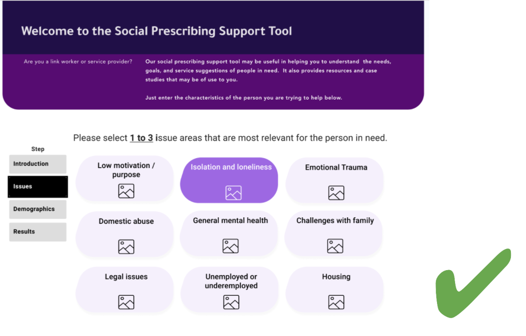 The tool provides ideas and suggestions for link workers based on an understanding of the issues and challenges of the person who needs help. The recommendations are drawn from link workers and social prescribers’ extensive experiences. The tool has received very positive feedback through the user testing phase from link workers and service providers, with particular benefits identified for those who are new to working in the social prescribing sector. The first prototype of the tool can be viewed here.