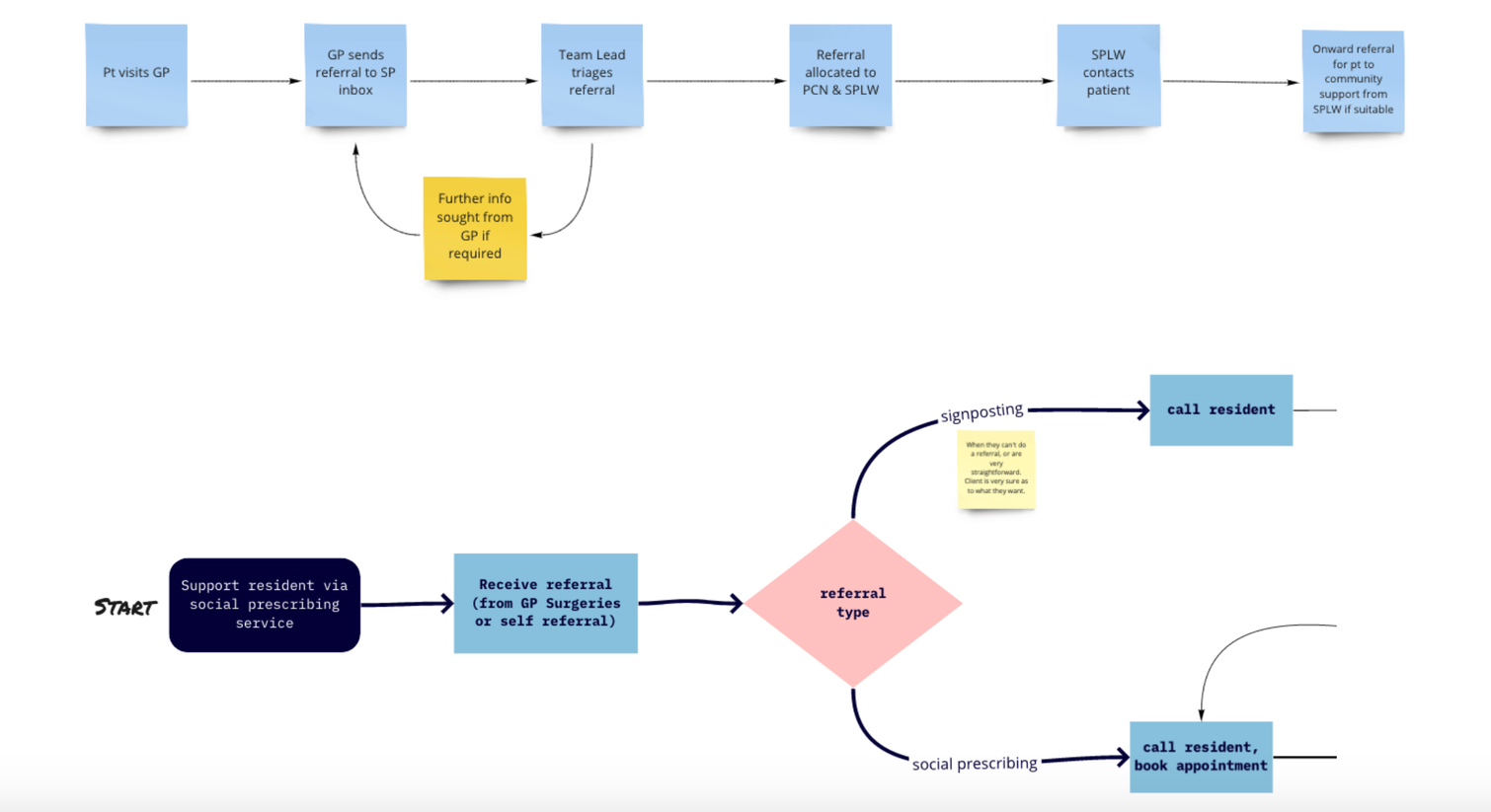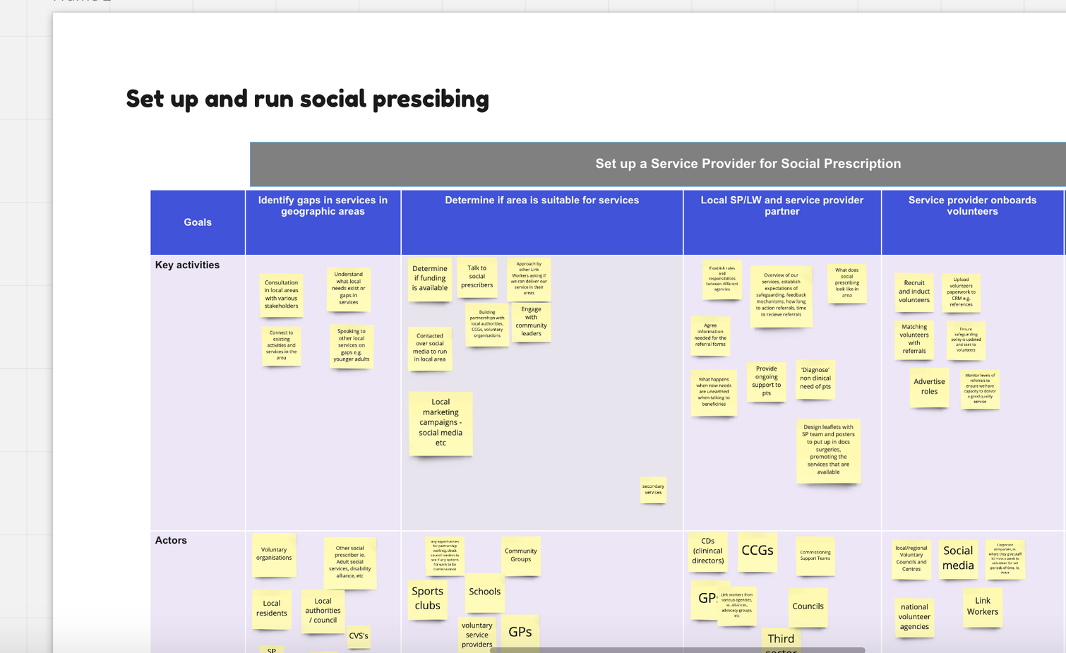 Quickly, the complexity of the social prescribing process, including the numerous actors involved, became evident. Yet having all the information in one place, and agreed upon, made it comprehensible and actionable. This activity also gave everyone a greater understanding of the wider social prescribing landscape.