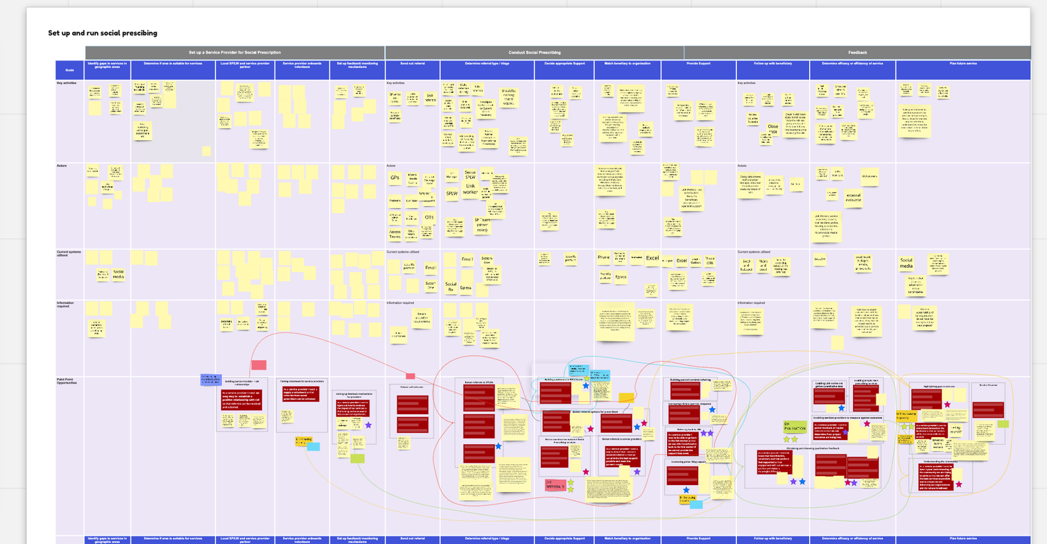 We conducted a deep dive into social prescribing to comprehensively understand the processes, services and touchpoints involved. To do this, we worked with our stakeholders to get them to ‘map out’ their services within social prescribing. We then refined each of their individual services into a larger ‘map’ or what’s known as a service blueprint, which gave us a deep understanding (and consensus) on the stages of social prescribing. From there, we detailed key activities and challenges at each stage.