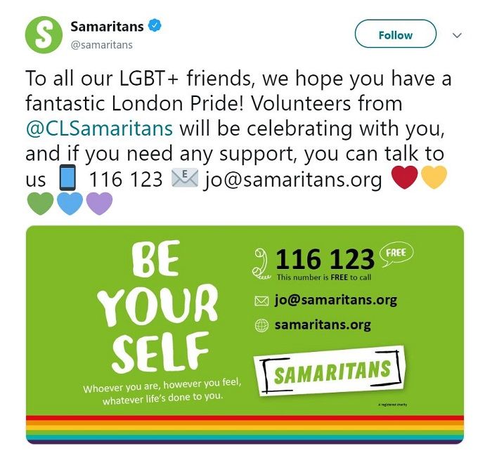 On July 7th, it was Pride in London and lots of charities got involved in a variety of ways. Some changed their logo to rainbow colours (including us), some were part of the parade and others used social media to celebrate the day and/or offer support. As much as Pride is a celebration of rights and the freedom to be yourself, unfortunately many still face prejudice and intolerance so this tweet by the Samaritans was lovely to see. We have lots more examples in our blog post in our Twitter Moment.