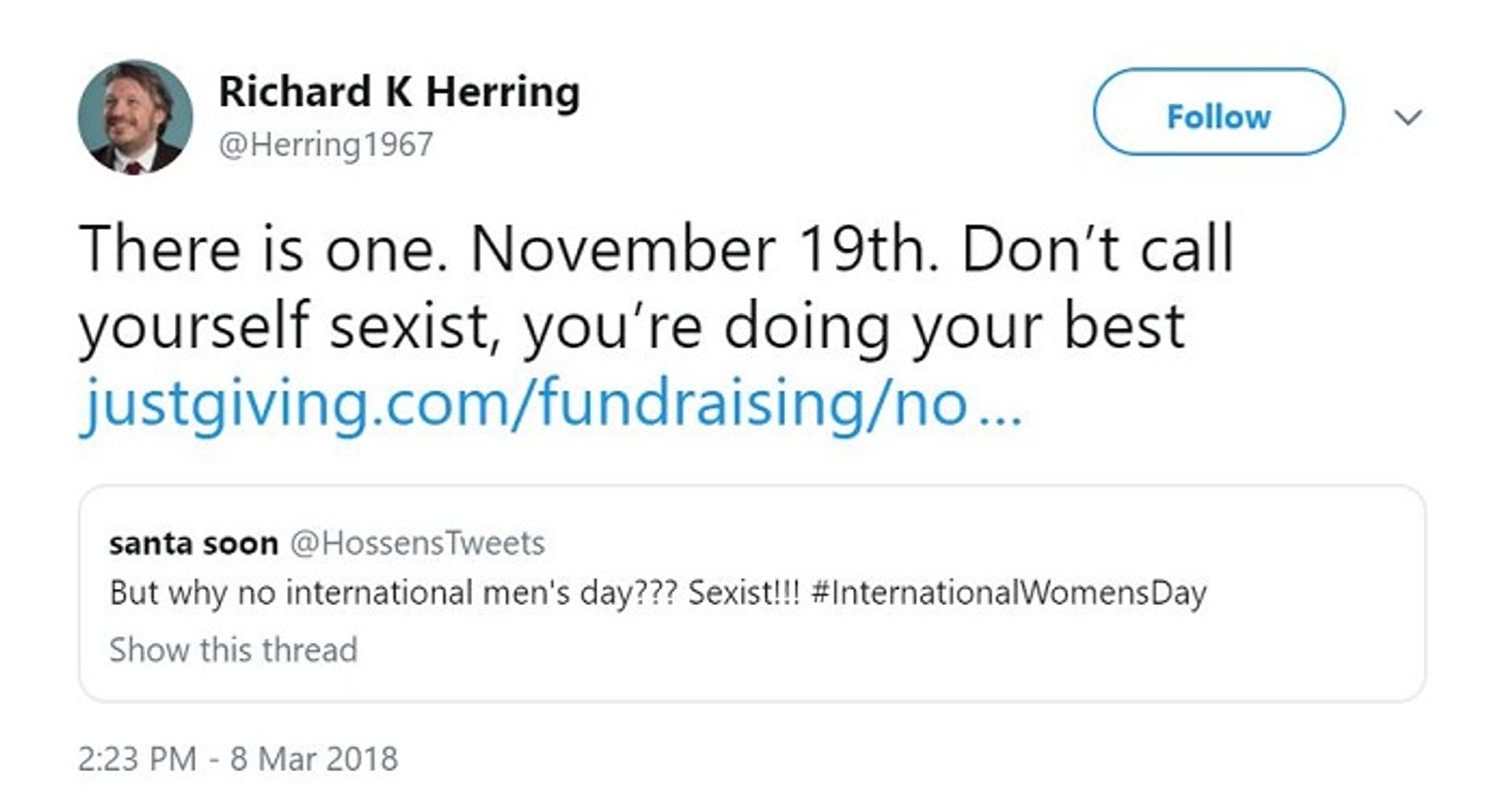 International Women’s Day takes place annually on 8th March and is a day to celebrate women around the world, their contribution to society and their achievements. Charities have cause to celebrate this day as there are countless women who have started charities, led charities, work for charities, are the Patron of charities etc etc and there is always fantastic content created for International Women’s Day. One of my favourites – though ironically – is from a man, Richard Herring. Every year the comedian raises money for domestic violence charity, Refuge, by replying to every tweet that asks when International Men’s Day is (it’s 19th November, by the way). Genius.