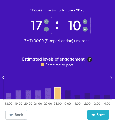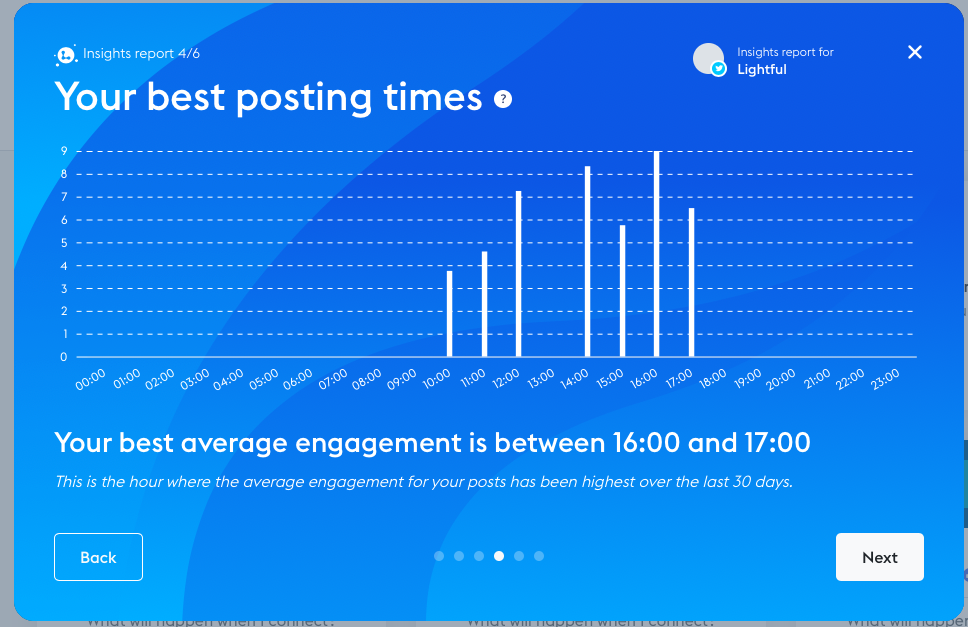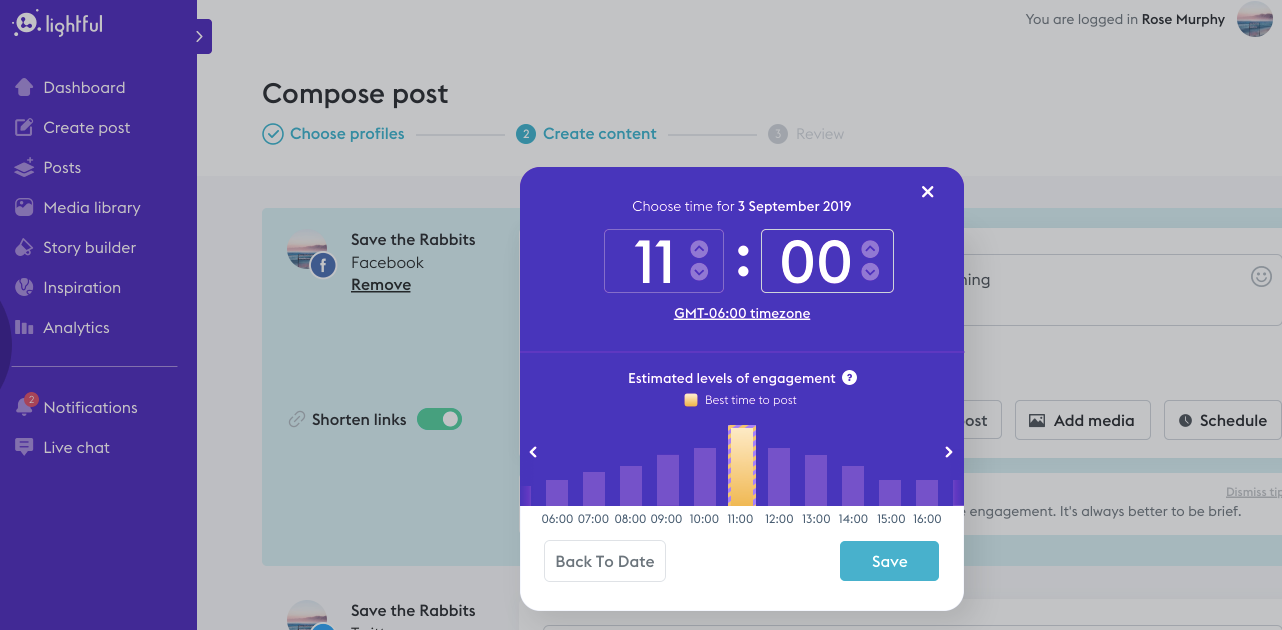 Log in to Lightful, and click ‘Create Post’. Draft an amazing post or tweet, and then click Schedule, once you’ve set a date, Lightful will advise you on the best time to post for that date based on your previous posts engagements.