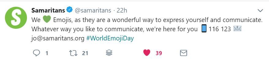 Samaritans used the trending hashtag to express their love of emoji and to remind people that, however they like to communicate, the charity’s helpline is there for them if they want to call, text or email.