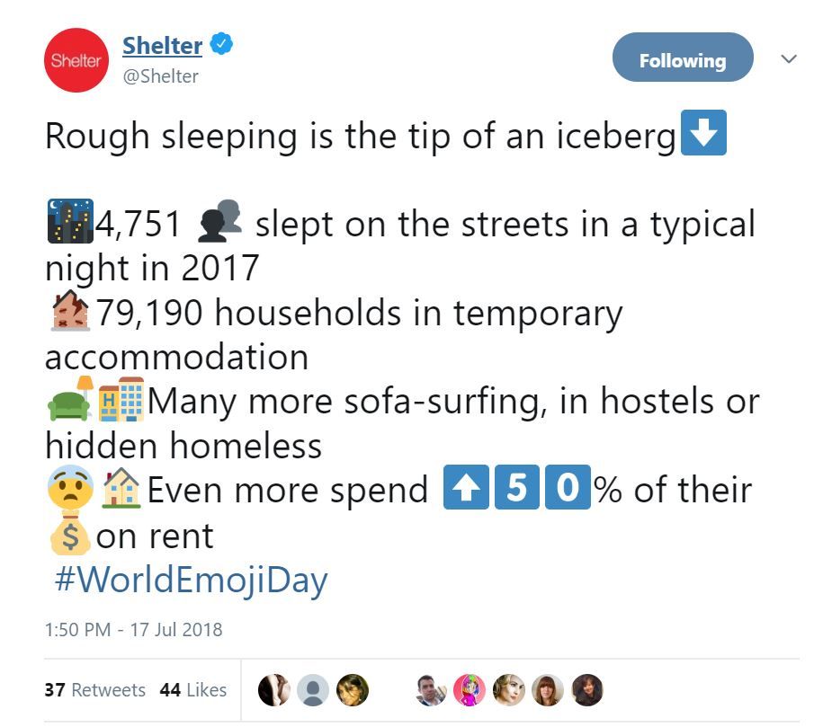 Excellent emoji use by Shelter, who often use trending hashtags to highlight statistics of rough sleeping, homelessness or rogue landlords. Who needs infographics when you have emoji?