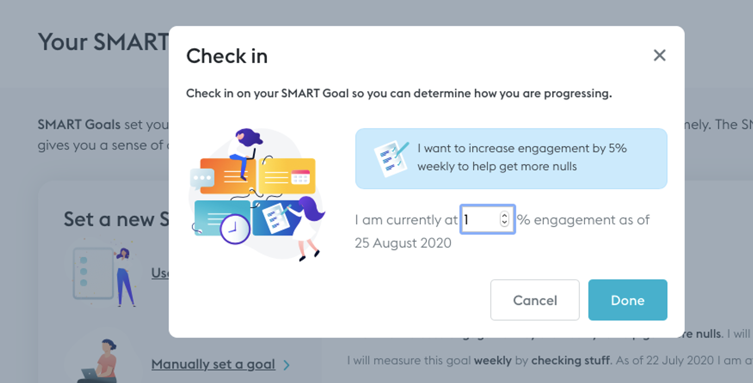 Creating your own SMART Goal allows you to customise the fields, but you will not receive any prompts for setting the goal, or benefit from our reporting features.