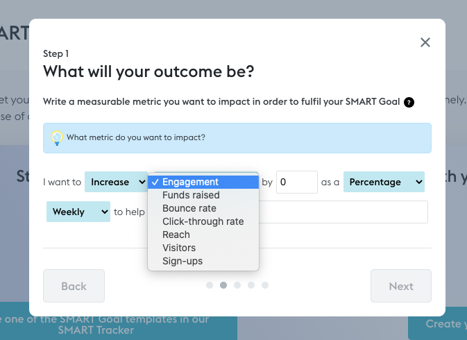 You will be guided in the process to create SMART goals that are aligned with your overall organisational objectives. Whether it’s around engagement, fundraising, or click throughs, the choice is yours.