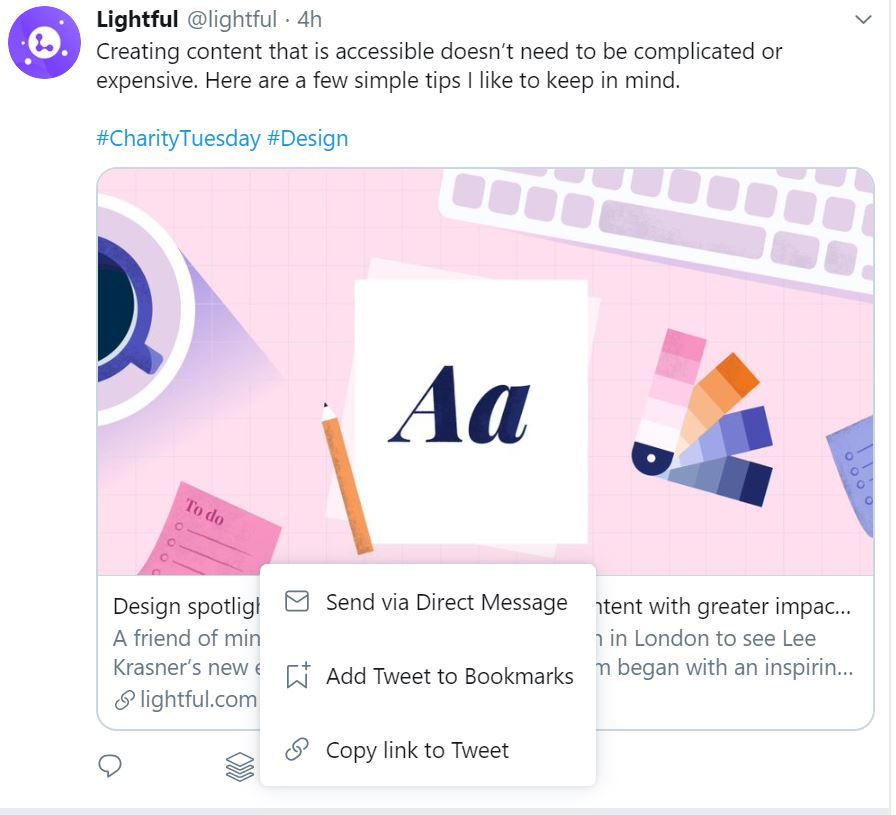 The new features include a bookmark tab – hooray! No more having to ‘like’ a tweet to save it. To save a bookmark, click on the share button at the bottom of the tweet then ‘Add tweet to bookmarks’. When you bookmark a tweet, there’s no notification so feel free to save those inspirational tweets from competitors without them knowing! Now if only they’d add the ability to organise by topic…