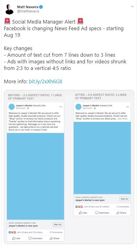 It’s not just Twitter that’s made changes. On 19 August, Facebook will be changing their media specs, which will affect how your posts look on the newsfeed. As social media expert Matt Navarra notes, the key changes are that the amount of text will be cut from 7 lines down to just 3. The maximum height for images and video will be changing to a shorter 4:5 aspect ratio (previously it was 2:3).