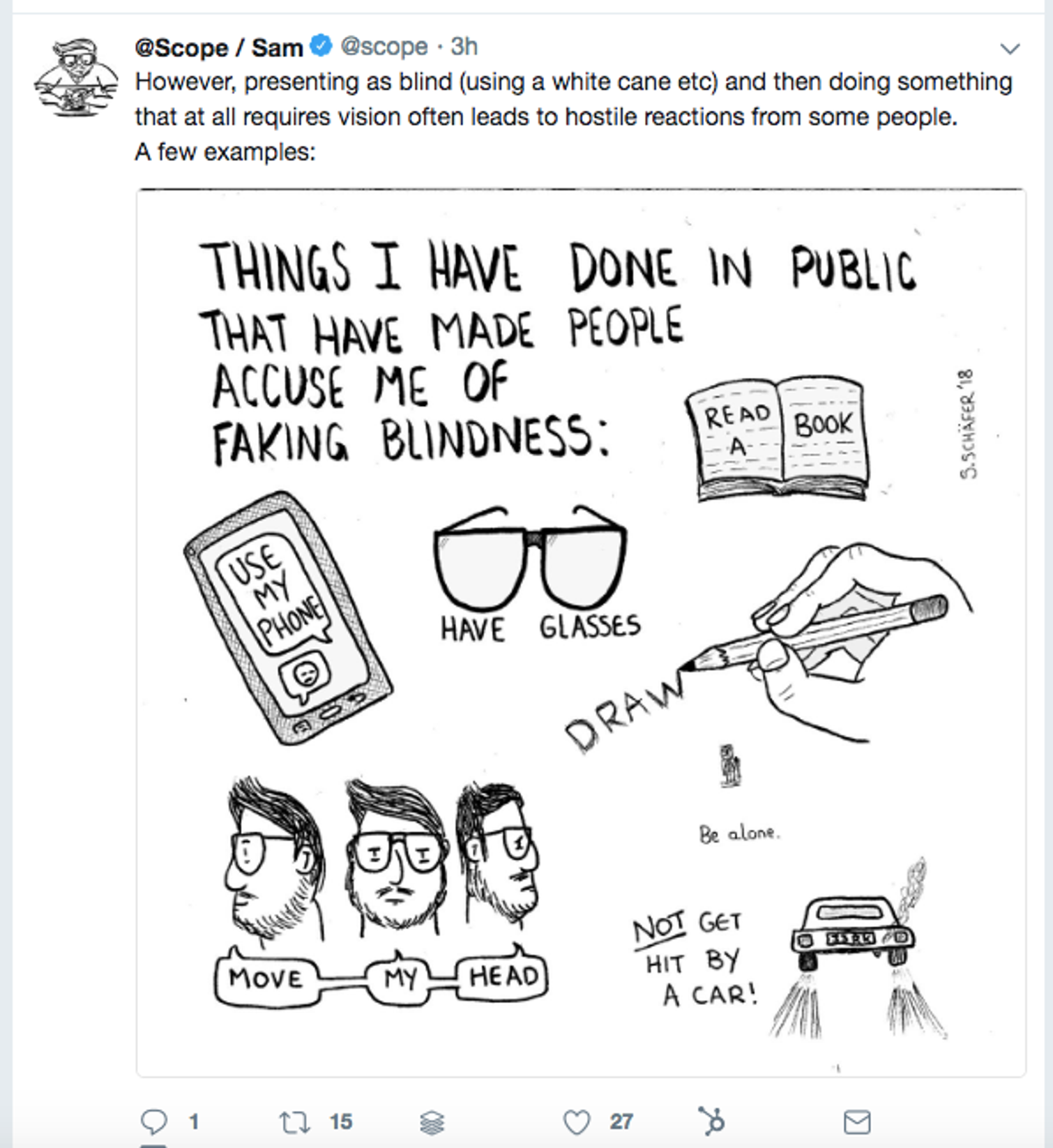A perfect example of this is from Scope, where they handed the keys to their account for the day to Sam. Sam shared his experience with being blind; aiming to raise awareness and spread understanding of the barriers people with visual impairments face daily.