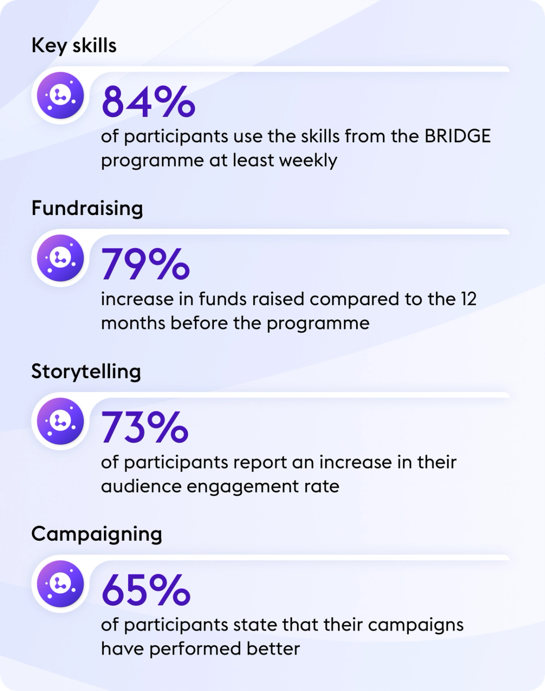 In December 2023, we launched a study to examine the impact of the BRIDGE programme on nonprofit organisations over the past five years. We asked about the impact of BRIDGE on their ability to tell authentic stores, enhance financial support for their vital work, and increase the positive effect on their communities. We received 253 responses from participants in 40 countries across Africa, Asia, Europe, South America and different corners across the USA, representing cohorts sponsored by 19 funders.