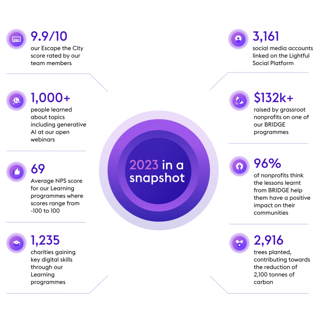 Our message and our mission over the past five years has been consistent: to help nonprofits become better storytellers, build trust, and raise more funds online. For the past five years Lightful has been delivering digital capacity building programmes to over 3,000 organisations. From the largest philanthropic foundations in the world, to the smallest nonprofits, we are working with changemakers of different sizes and cause areas to help build digital resilience within the sector.